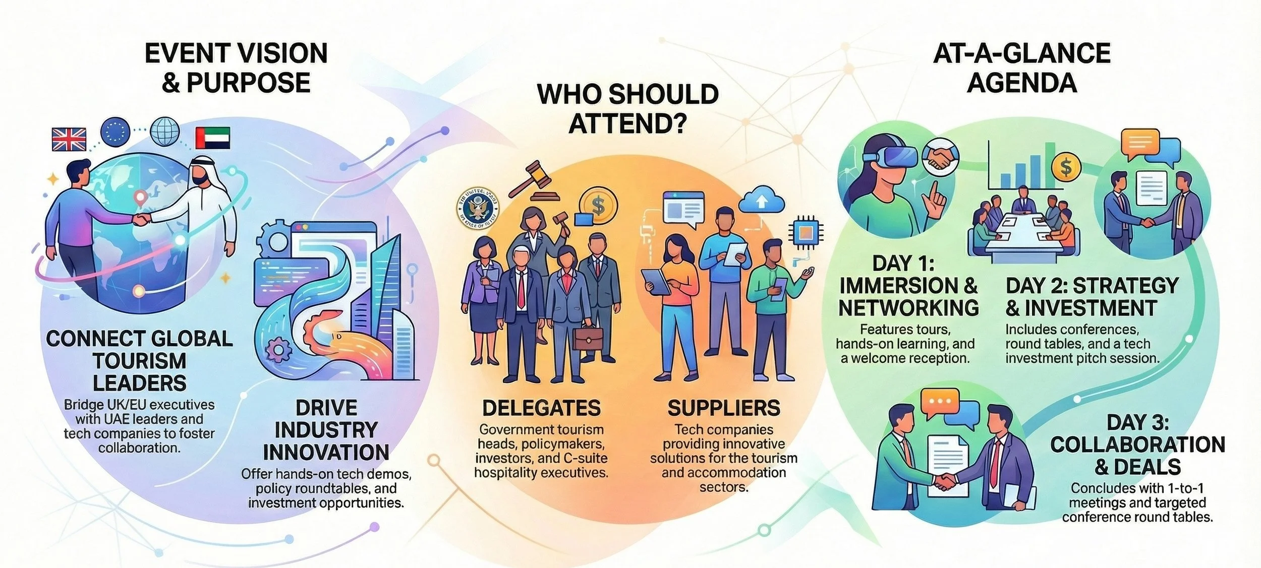 Engage in focused 1-2-1 meetings with industry peers and innovators, attend inspiring conference sessions, and conclude the event with a wrap-up, reflecting on key insights and future opportunities in tourism & technology.